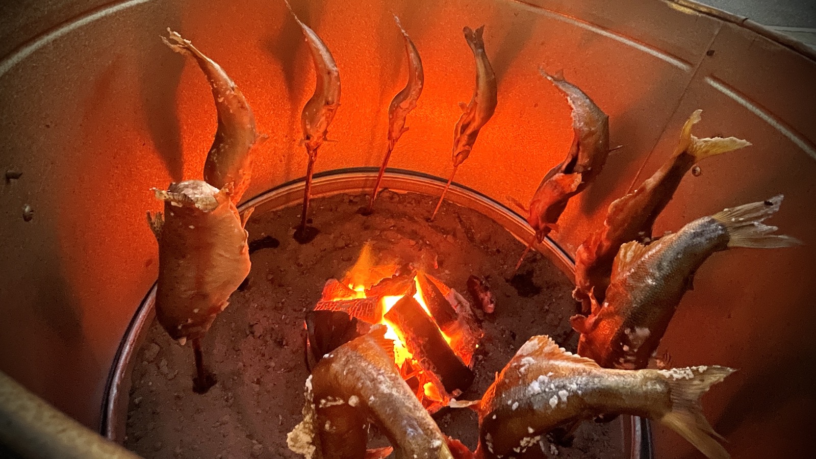 アユを竹串に刺して塩をふり、炭火で1時間以上かけてじっくり焼き上げます。炭火の遠赤外線効果で焦げ目をつけることなく、フワフワでカリッと仕上げるが、飛騨高山「鮎太郎」のアユの塩焼きの特徴です。